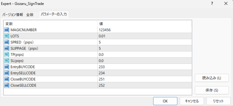 CloseBUYCODE買いポジションをクローズするサインコードを設定します。